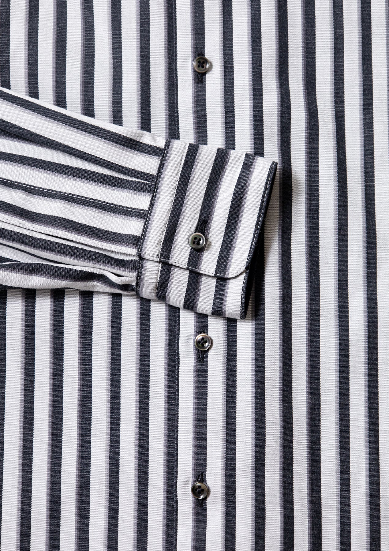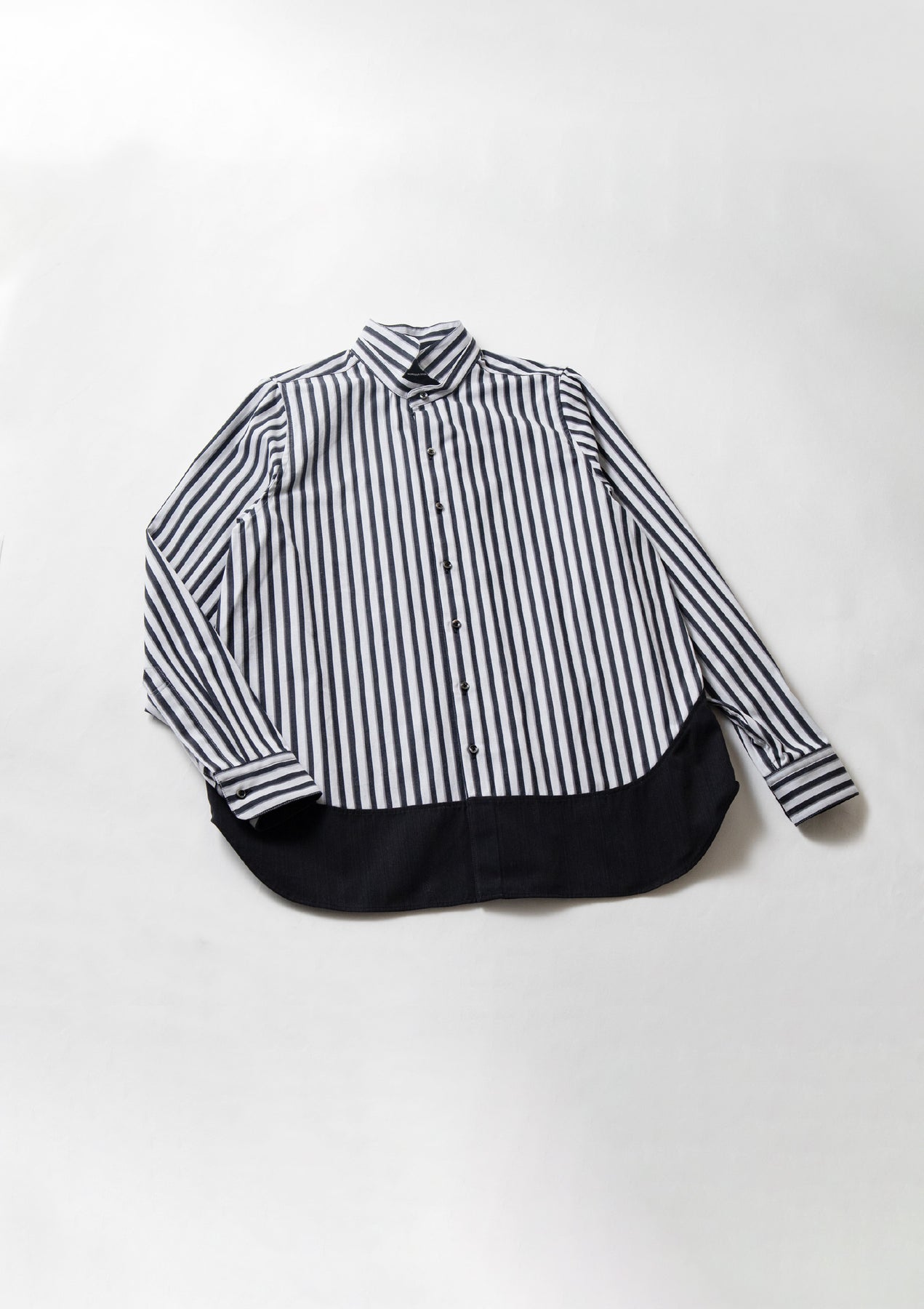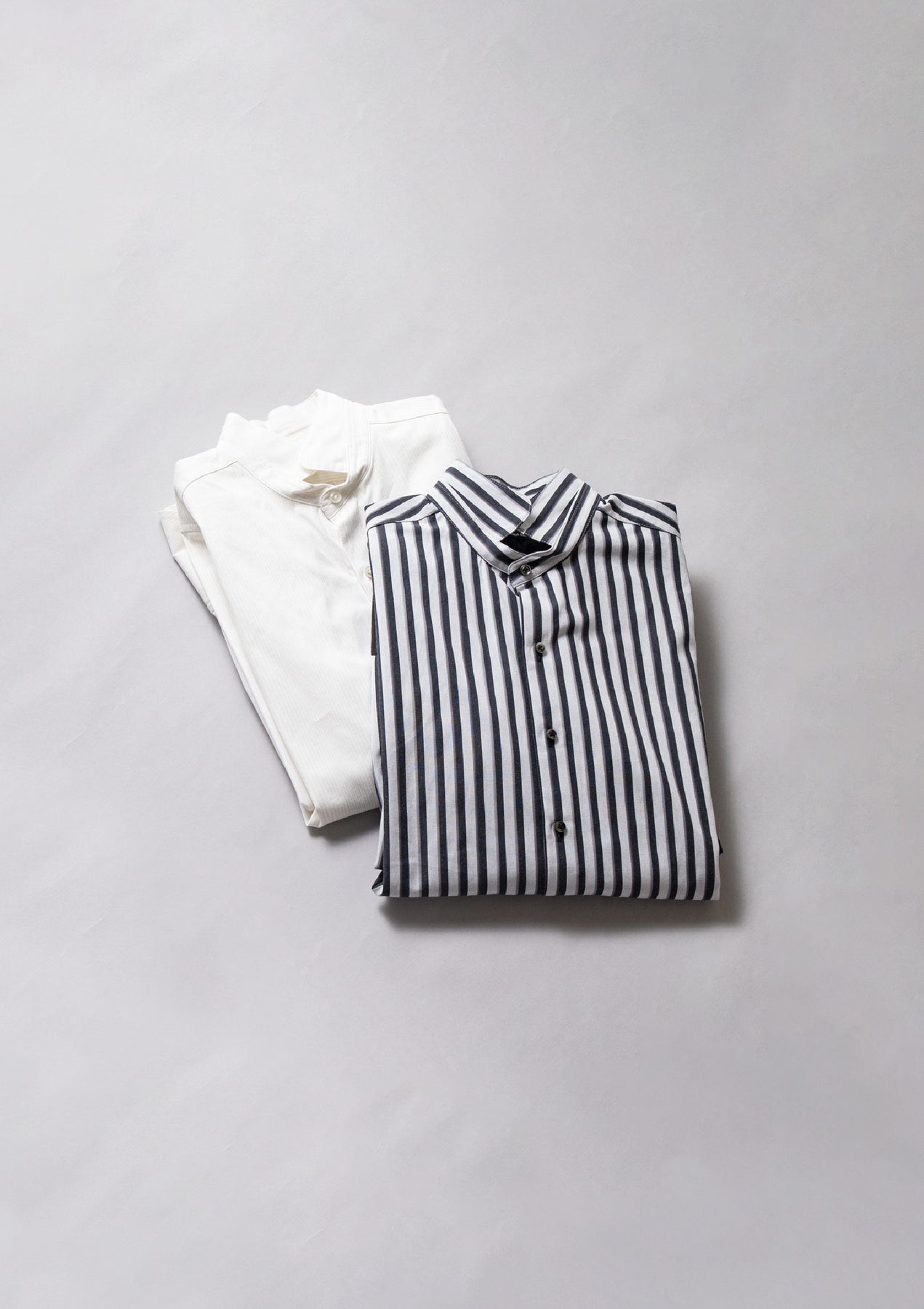 クレリックシャツは本来、襟と袖に白生地を使用したシャツですが、MateriaLがデザインしたこのシャツは、襟と袖の縞向きを切り替える事でクレリックシャツのデザインを表現しています。