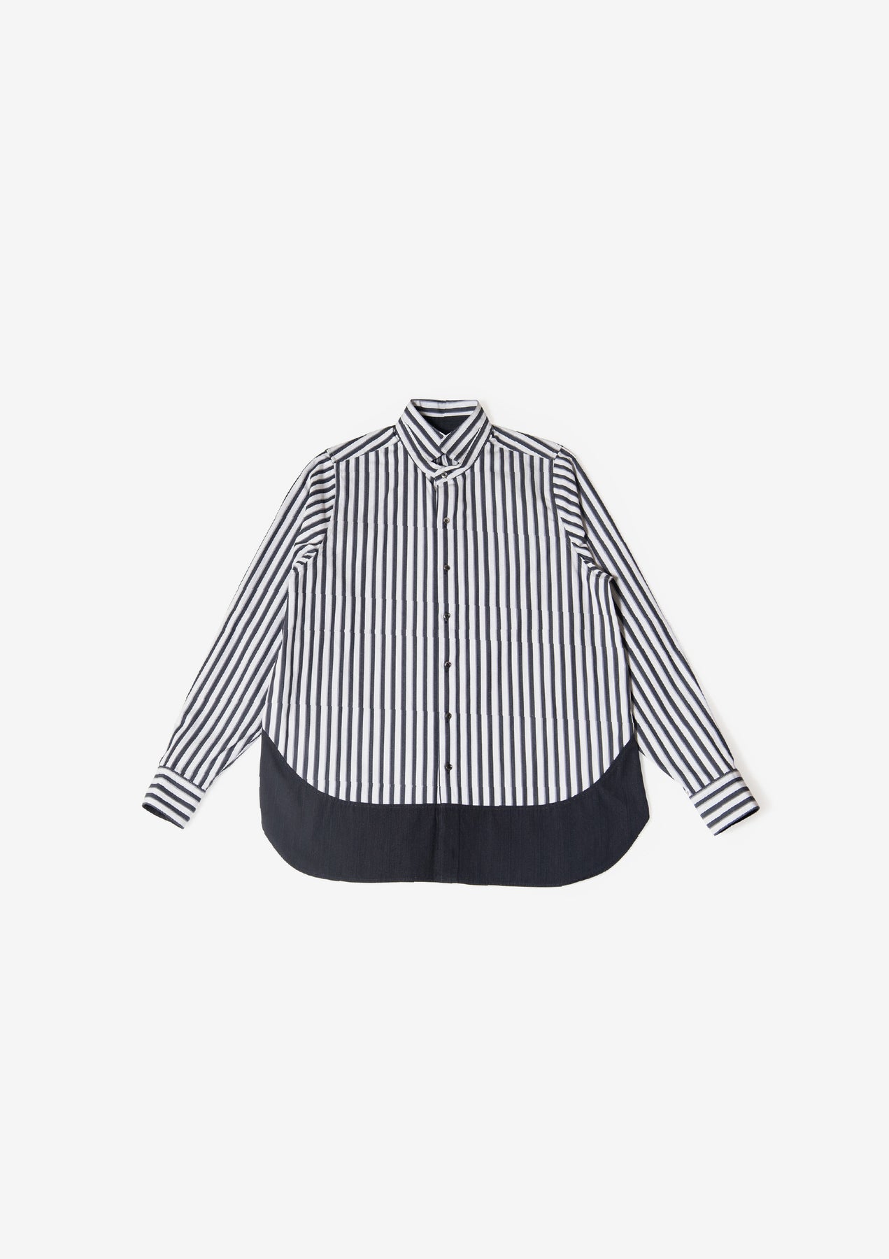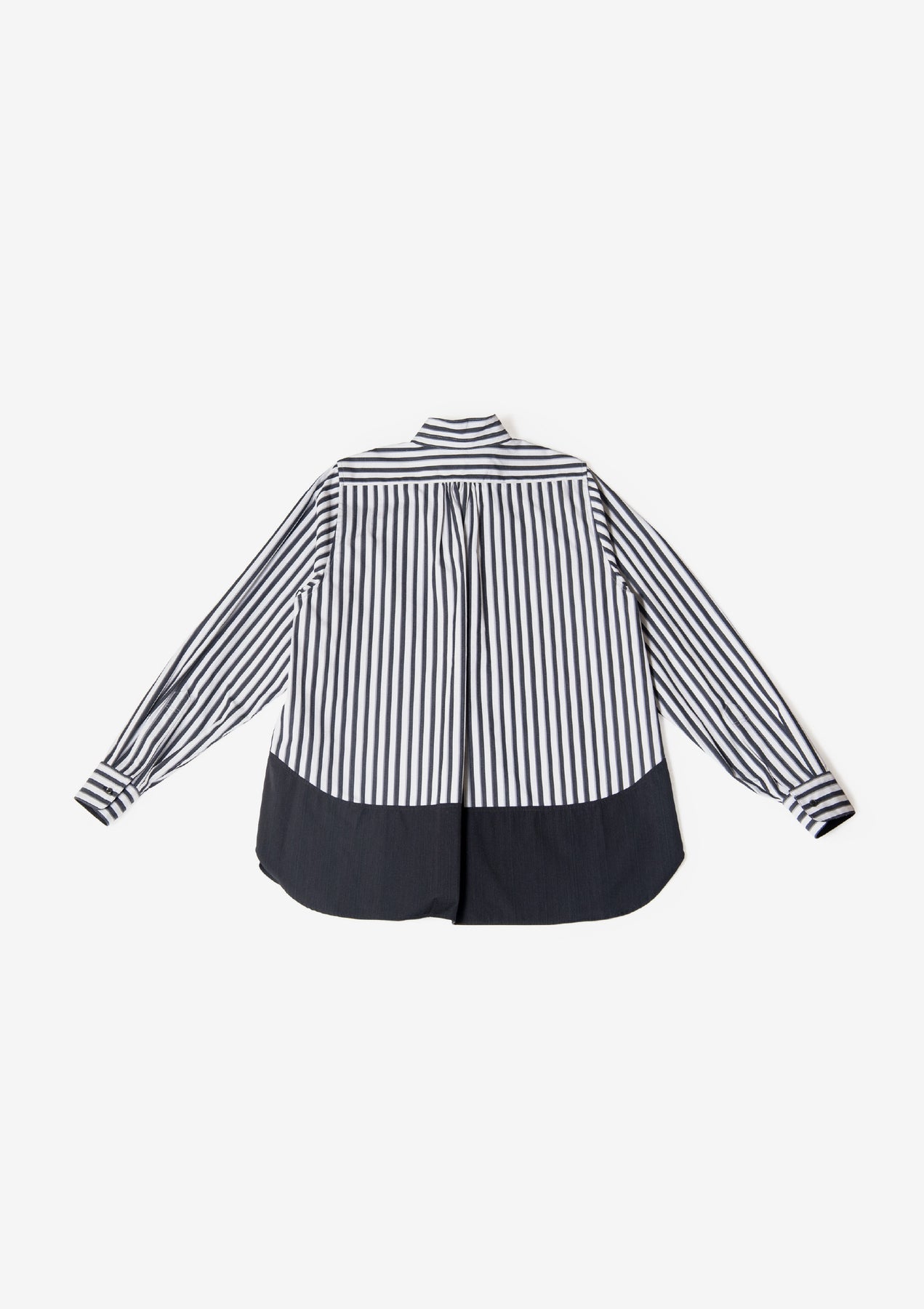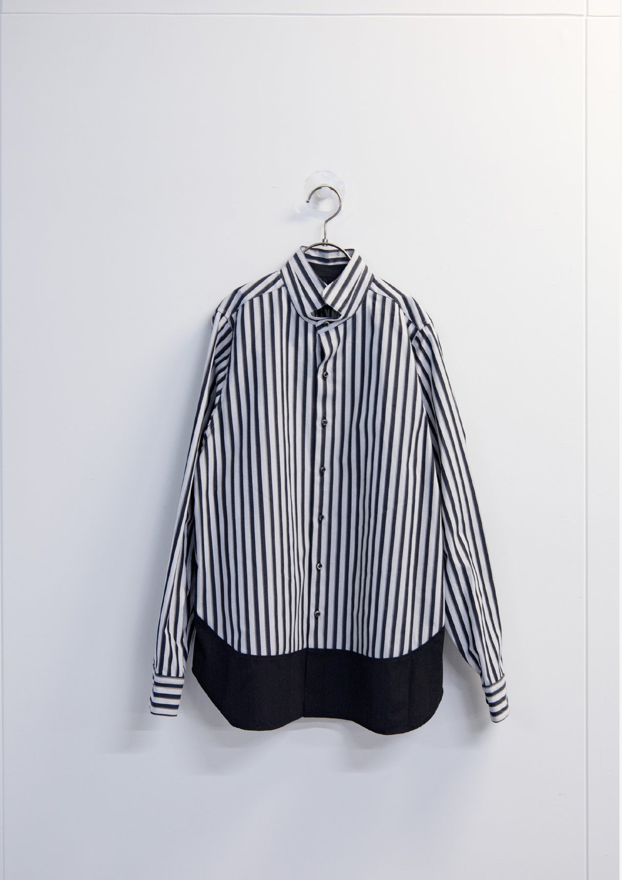 クレリックシャツは本来、襟と袖に白生地を使用したシャツですが、MateriaLがデザインしたこのシャツは、襟と袖の縞向きを切り替える事でクレリックシャツのデザインを表現しています。