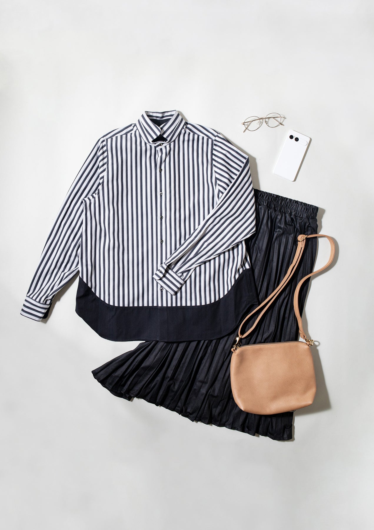 メンズファッションシーンで多く採用されるクレリックシャツですが、小ぶりな襟と、背面に施されたタックから裾に向かって広がるシルエットが、さりげなく女性らしさを演出します。